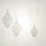 - Christmas silver chandelier set: Andrea pendant necklace price of SGD$152, and Signature Clover Chandelier earrings price of SGD$97. Andrea pendant necklace — hand set cubic zirconia pave filigree pendant adorned with over 200 cubic zirconia stones. Signature clover chandelier necklace — Silver plated chandeliers featuring our signature clover motif, 5.1 drop length.