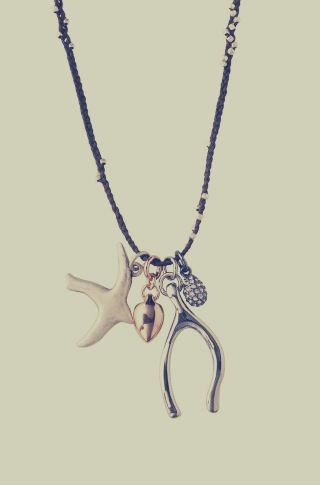 Tranquility Necklace, price of SGD$112. A treasured cluster of matte silver, shiny white bronze, and hematite plated luck and peace charms dangle from a hand braided cotton thread with silver plated beads. 76 cm length with 5 cm extender.